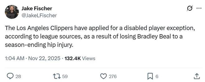 在小卡持续伤缺的情况下,另外一名得分核心比尔更是因髋部骨折早早赛季报销,名记Jake Fischer曝出快船队已经为此申请了伤病特例。