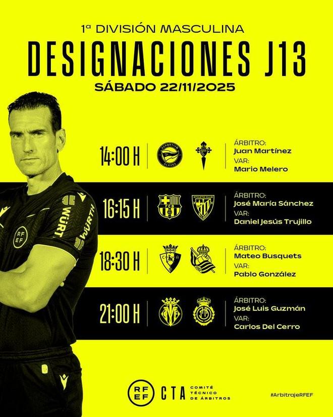 北京时间11月21日,西甲官方公布了联赛第13轮第1比赛日的裁判名单,何塞-桑切斯执法巴萨vs毕尔巴鄂竞技。