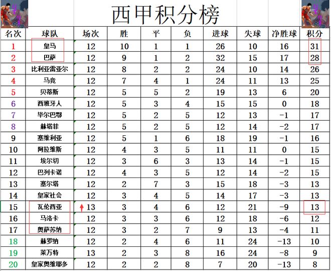 积分榜方面,前12轮,皇马3分优势力压巴萨领跑,本轮巴萨将在主场对战劲敌毕尔巴鄂竞技,皇马则是客场对阵埃尔切。瓦伦西亚今天最后阶段绝杀赢球拿下保级大战,他们就暂时超过马洛卡,奥萨苏纳上升到15位,输球的莱万特还是倒数第2陷在降级区内。